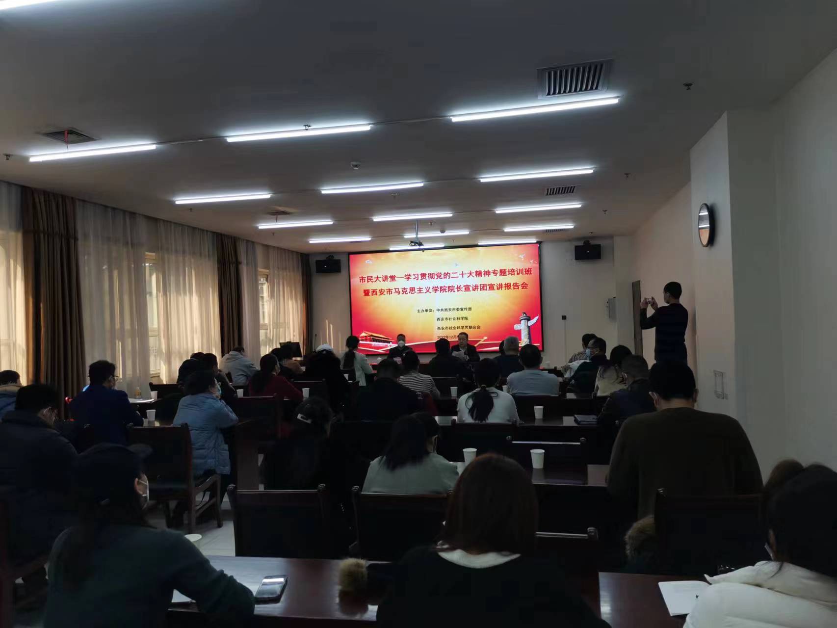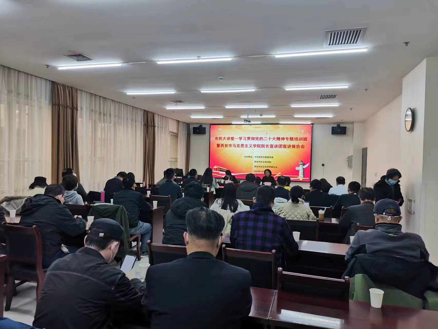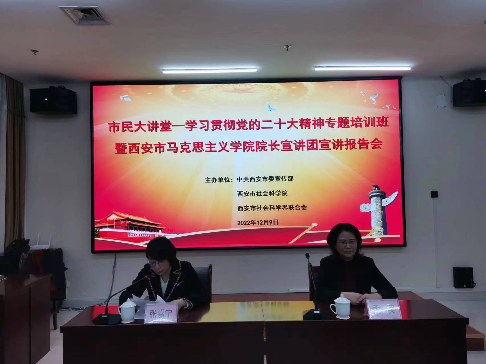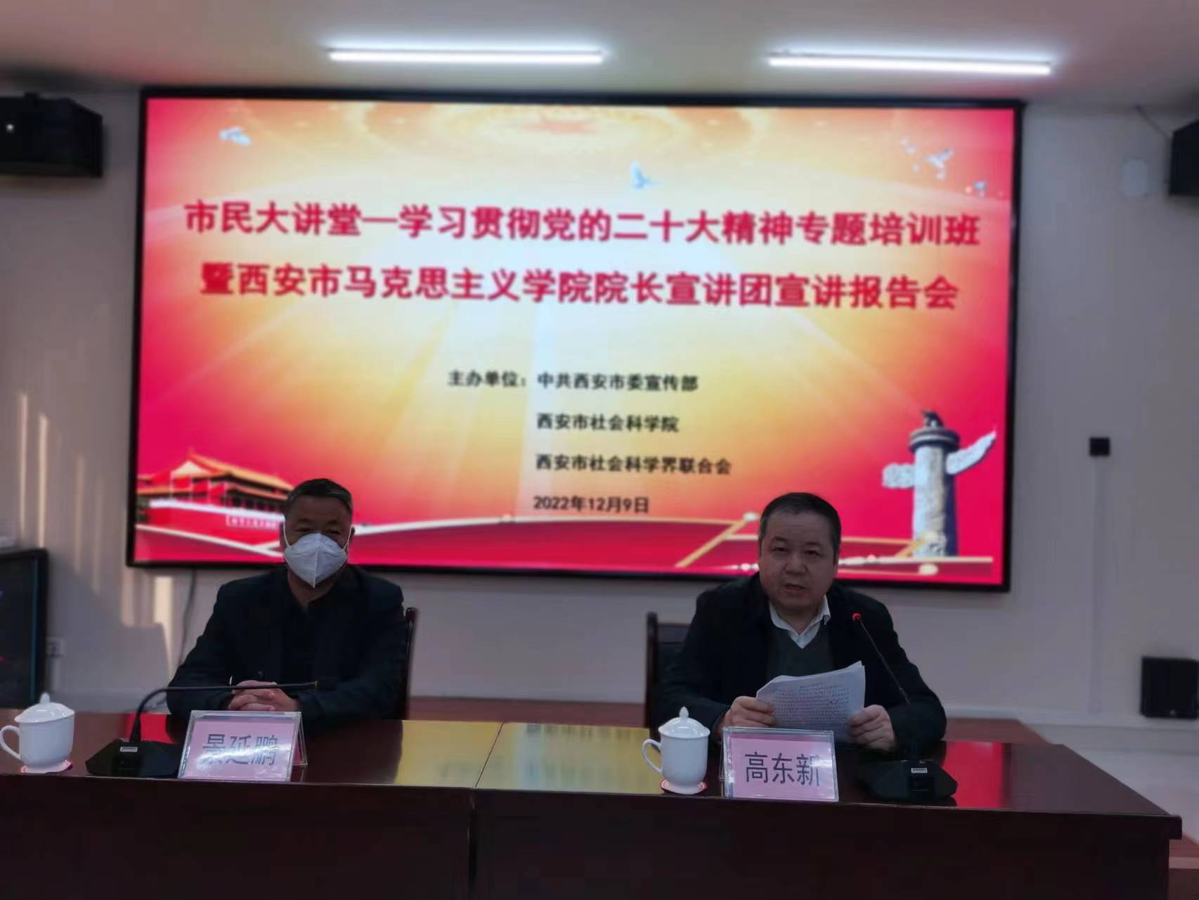 12月9日,由市委宣传部、市社科院(市社科联)联合举办的市民大讲堂——学习贯彻党的二十大精神专题培训班暨西安市马克思主义学院院长宣讲团宣讲报告会在陕西社会主义学院举行。会议邀请西安文理学院教授、市党的二十大精神马克思主义学院院长宣讲团成员孟英,西安铁路职业技术学院马克思主义学院院长、教授,省、市党的二十大精神马克思主义学院院长宣讲团成员景延鹏分别作了题为《全面建设社会主义现代化国家的政治宣言和行动纲领》《谱写新时代中国特色社会主义更加绚丽的华章》专题报告。