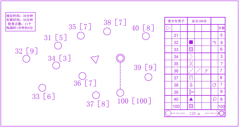 积分赛:本次比赛采用积分赛的方式,积分赛是指每个检查点根据远近或难易程度被赋予一定分值,参赛者在规定时间内自己规划顺序到访各个检查点,以获取尽可能多的积分,以积分多少判定名次,积分相同按照完成时间排定名次?;侄ㄏ虻墓娑ㄊ奔涫腔袢∮行Щ值氖奔洌绮稳叩谋热奔涑檬奔?,将按照规则被罚分。如超过有限时间,将取消比赛成绩,成绩无效。