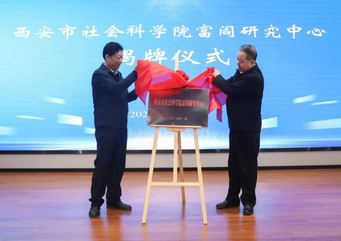 高东新与杜银虎共同为“西安市社会科学院富阎研究中心”揭牌并互赠书籍,双方共建“西安市社会科学院富阎研究中心”,发挥西安市社会科学院智囊优势,借力园区项目实践经验开展课题研究。