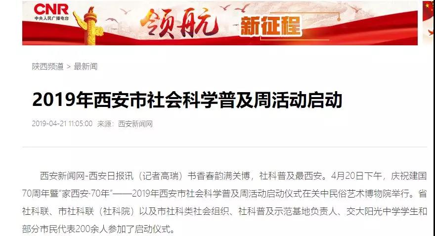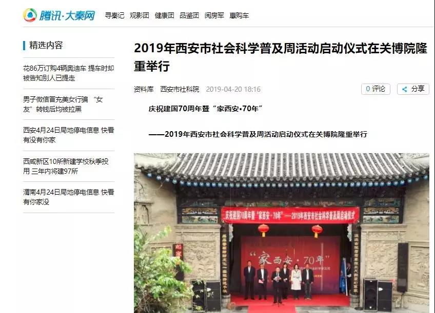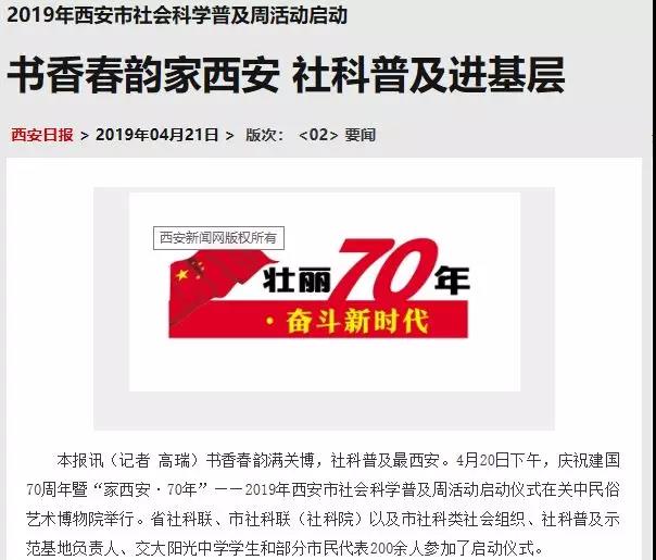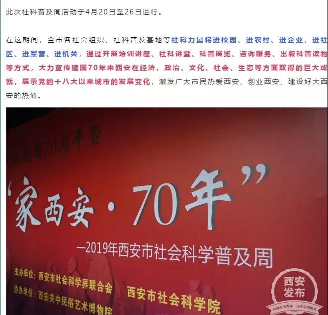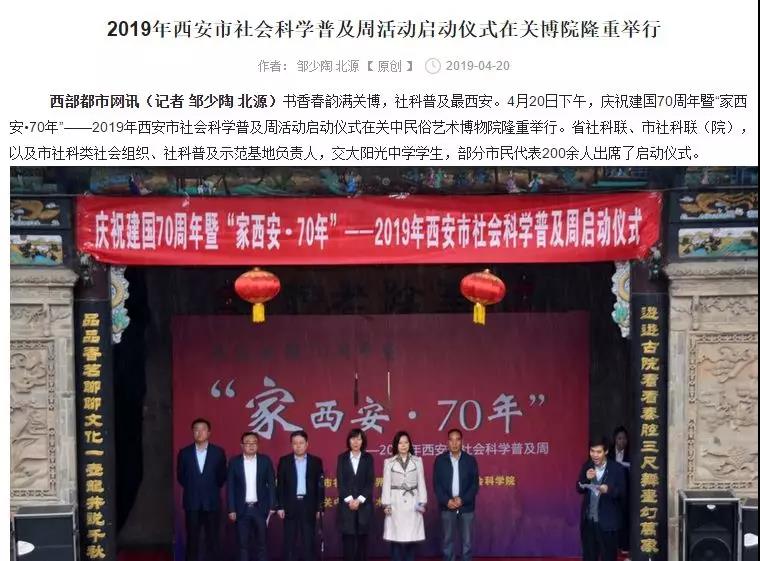 4月20日,庆祝新中国成立70周年暨“家西安·70周年”——2019年西安市社会科学普及周活动启动仪式在关中民俗艺术博物馆顺利召开。陕西省社科联、西安市社科联以及西安社科类社会组织、学协会代表和广大市民代表参加了启动仪式。