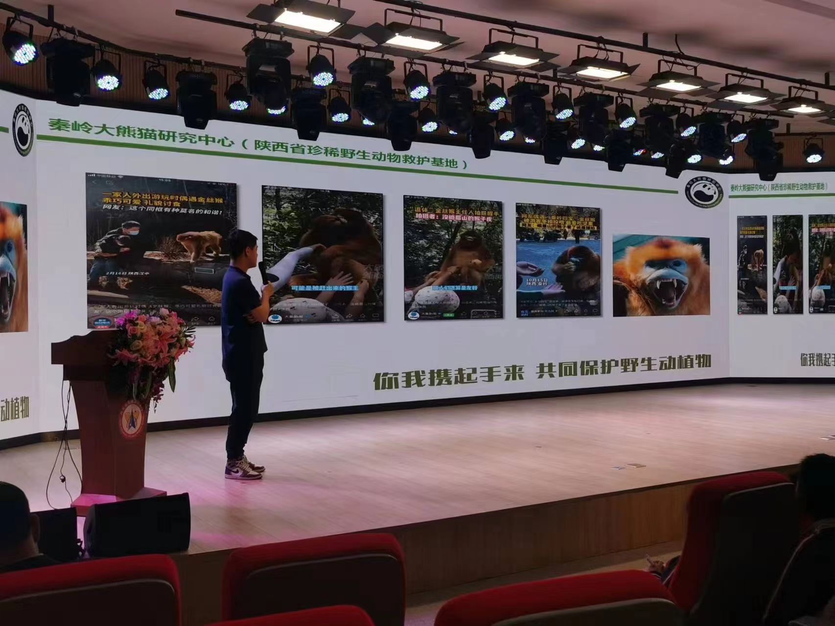 秦岭大熊猫研究中心、(珍稀野生动物?;ぶ行模┑目破绽鲜︺杉温。谩肚亓胨谋退呐笥选肪赖亩跋?,将秦岭四宝朱鹮、大熊猫、金丝猴、羚牛展现的活灵活现,让师生们如身临其境。他讲述了朱鹮的发现到目前的生存现状以及全球唯一圈养棕色大熊猫“七仔”的故事,同时给孩子们普及了秦岭野生动物的救护知识。